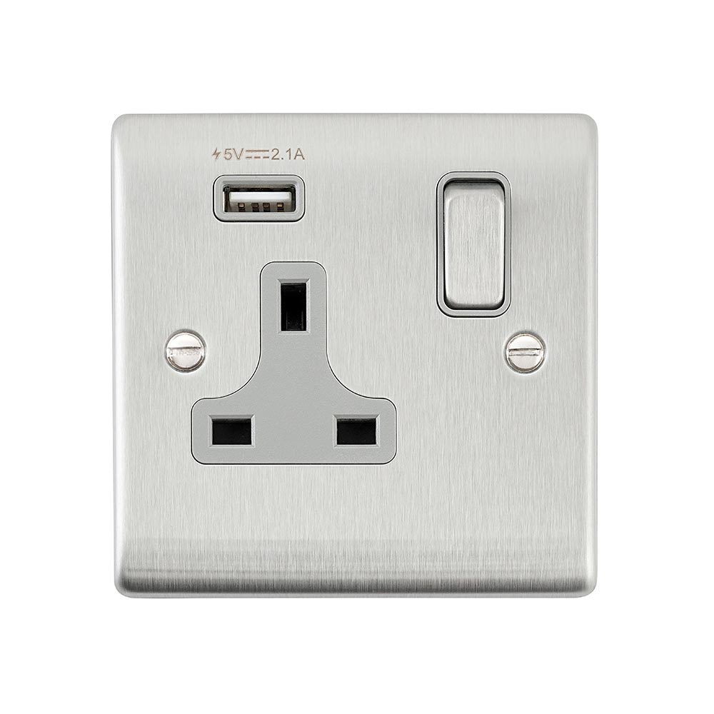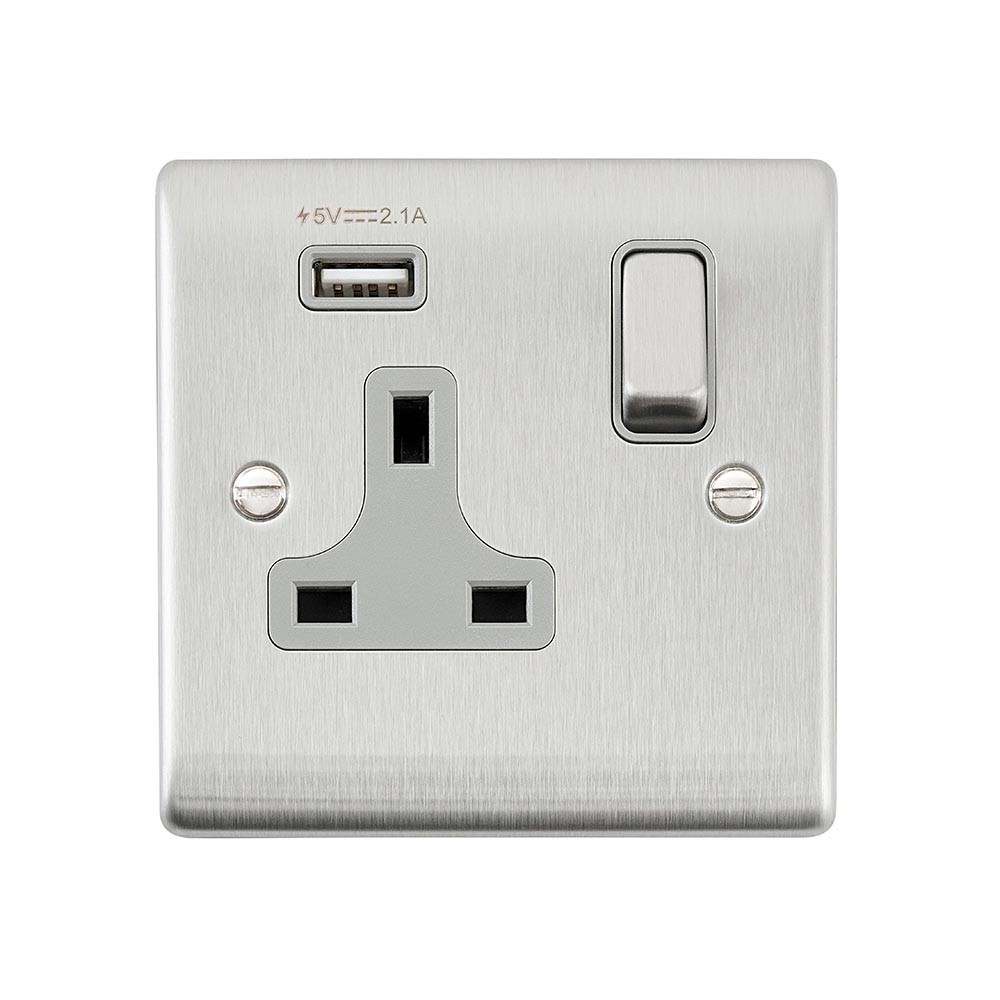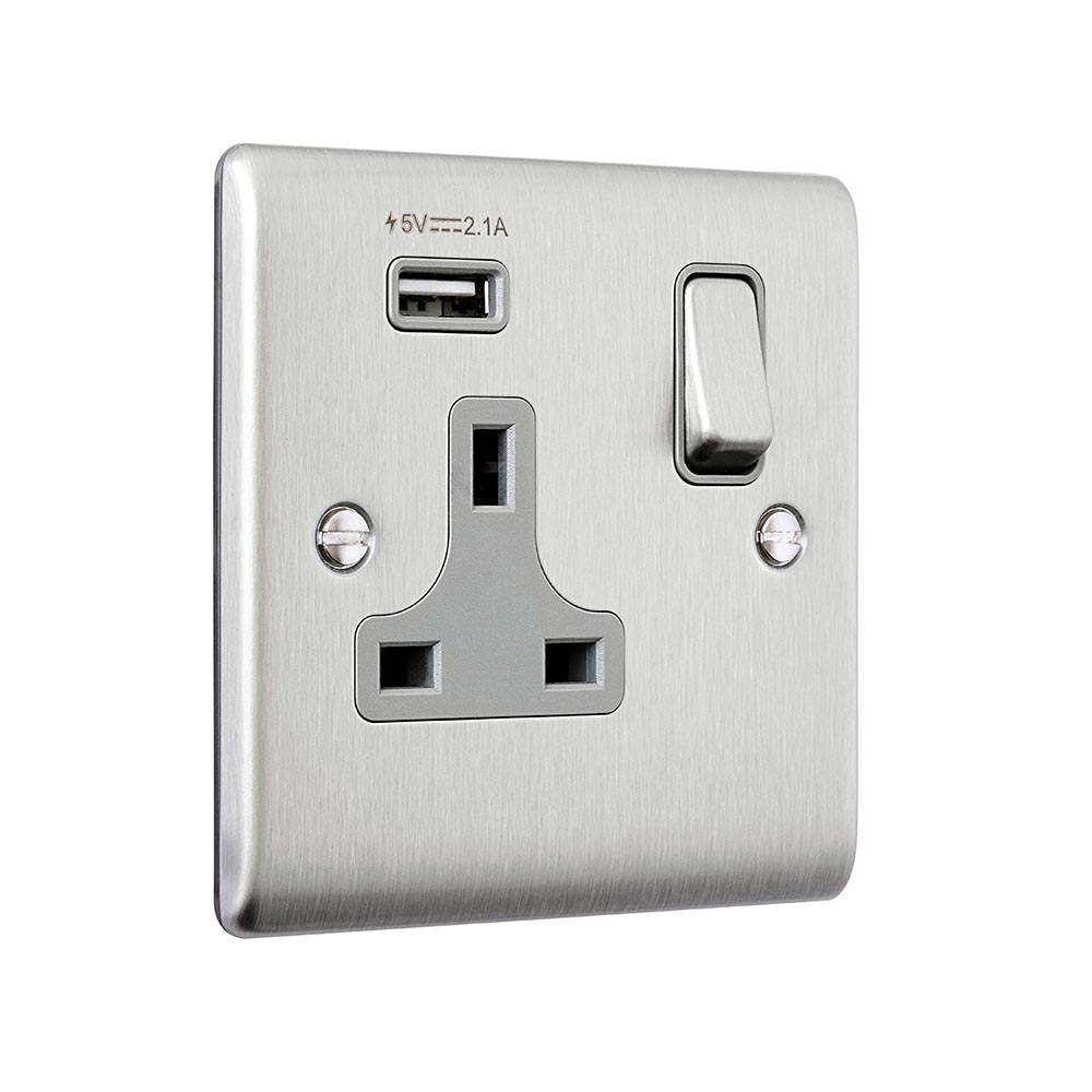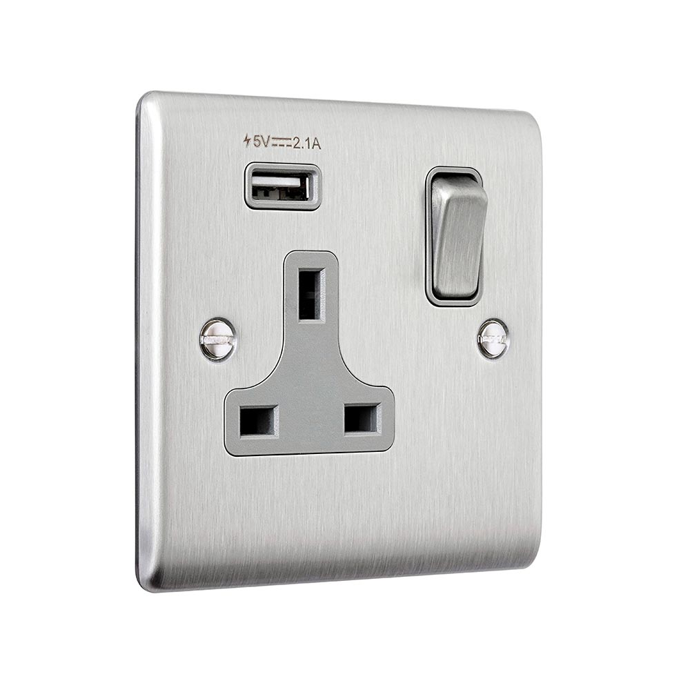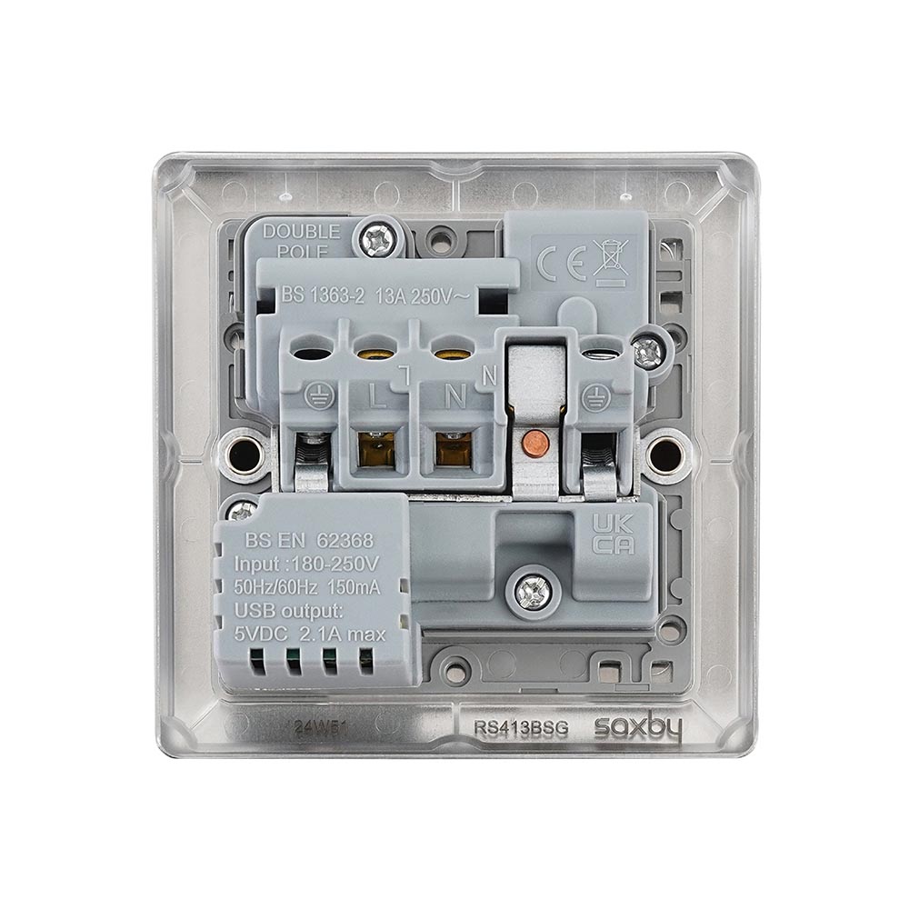 Our 13A rated socket boasts angled in-line terminals with captive screws which provide for quick and easy access and a hassle free installationIntegrated with 1x 2.1V USB A portSupplied with fixing screwsTwin earth fitted as standard to allow a double earth facility for installations that require a high integrity protective connection Double pole switching for the peace of mind of a safer installation of your socketMoisture gasket as standard to help prevent any moisture transfer to decorative front plateWe recommend a minimum mounting box depth of 25mmCertified to BS 1363-2; BS EN 62368