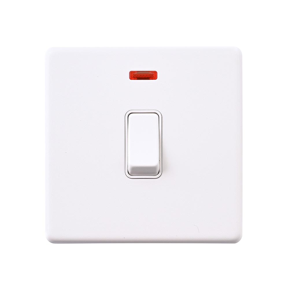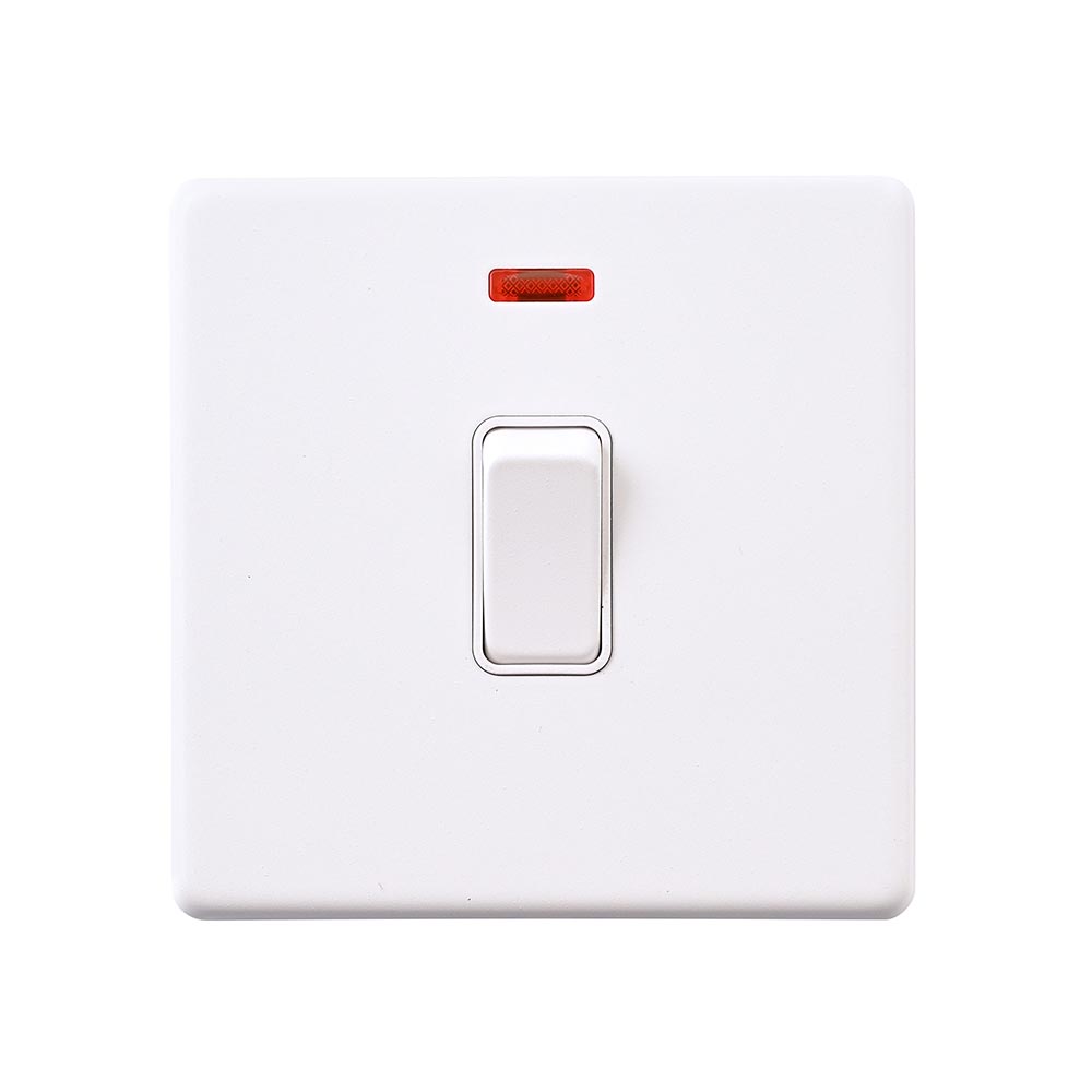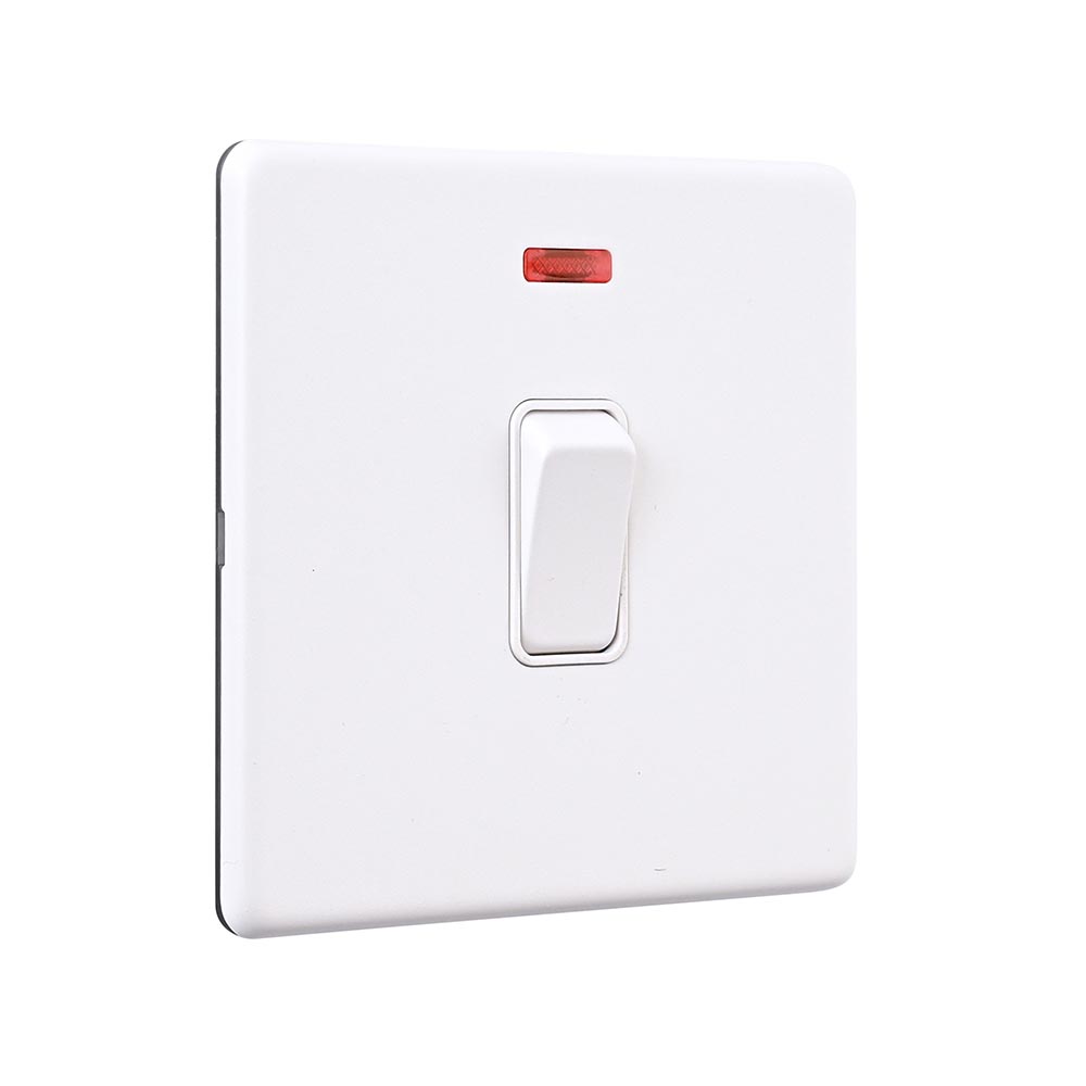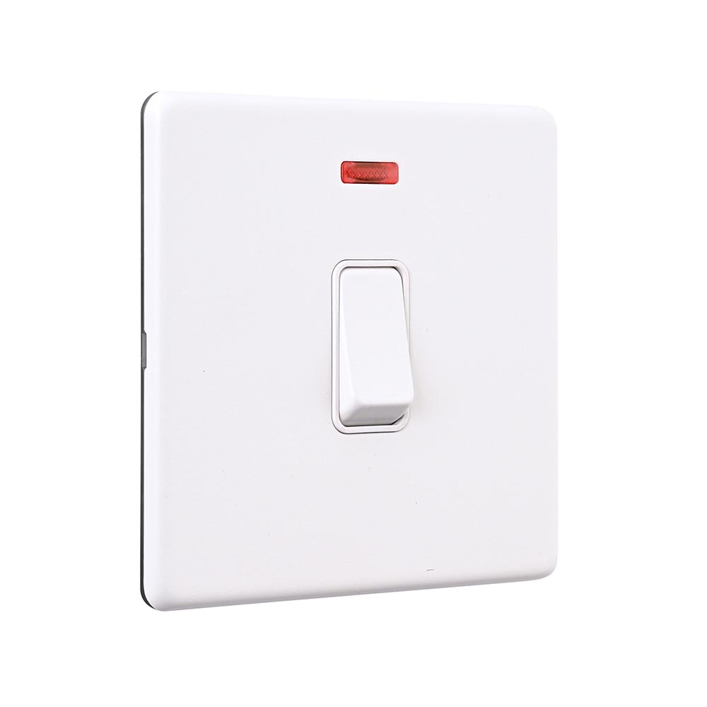 Our 20A rated switch boasts captive screws which provide for quick, easy and a hassle free installationSupplied with fixing screwsDouble pole switching for the peace of mind of a safer installation of your socketFlush neon power indicator on faceplateMoisture gasket as standard to help prevent any moisture transfer to decorative front plateOur screwless ranges boasts a slim profile of 4.5mm. The faceplate clips on and off easily due to the four locking points on the rear of the plate making for secure fit.We recommend a minimum mounting box depth of 25mmCertified to IEC/BS EN60669