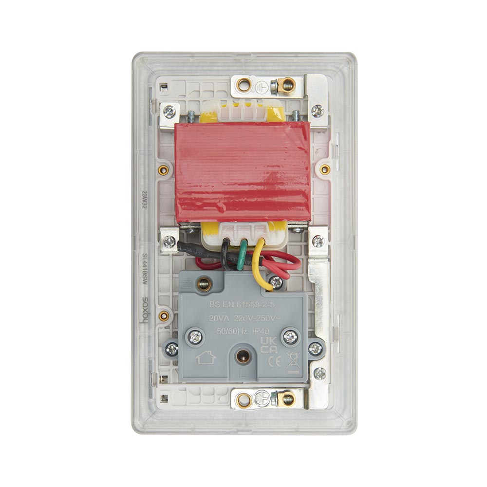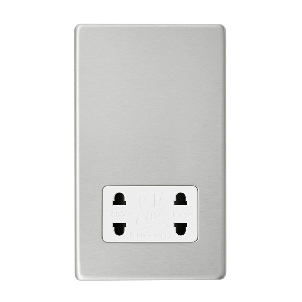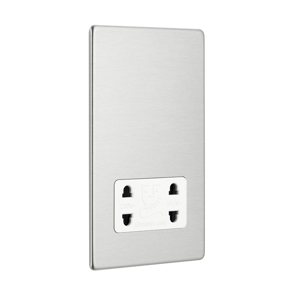 Our Dual Voltage shaver socket is rated to 115/240V is quick and easy to installSupplied with fixing screwsCaptive screw terminals to help prevent screw lossSuitable for both shavers and electric toothbrushesTwin earth fitted as standard to allow a double earth facility for installations that require a high integrity protective connection Moisture gasket as standard to help prevent any moisture transfer to decorative front plateOur screwless ranges boasts a slim profile of 4.5mm. The faceplate clips on and off easily due to the four locking points on the rear of the plate making for secure fit.We recommend a minimum mounting box depth of 47mmCertified to BS EN 61558-2-5